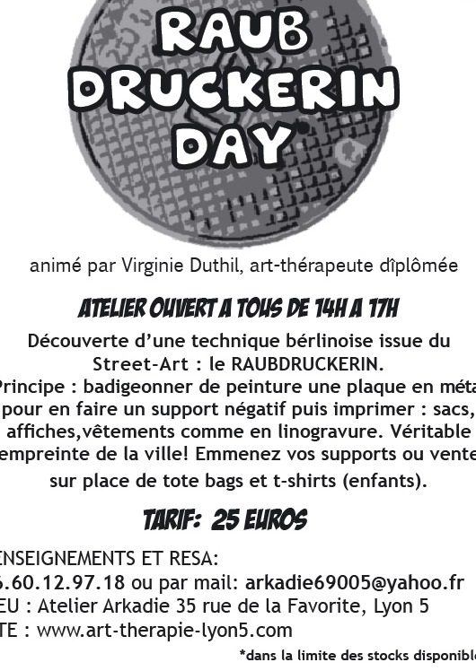 Cette nouvelle technique de street-art le «RAUBDRUCKERIN », qui est à la base un projet expérimental Berlinois, utilise les diverses plaques en métal, plus ou moins décorées, aux alentours de l'atelier et présentes dans les rues (égouts, eau, gaz…). Une fois badigeonnée de peinture, la plaque devient le support négatif d’une impression à même la rue (comme en linogravure). Véritable empreinte authentique d’une ville, le t-shirt ou le tote bag réalisé devient une pièce unique et directement « sérigraphiée » dans la rue.
